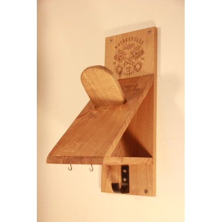 Pour les motards désireux d'organiser leurs affaires de moto. Ce support en chêne massif vous permettra d'accueillir votre casque bien sûr, mais également de loger vos gants et accessoires, d'accrocher votre blouson et de suspendre vos clefs.